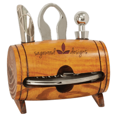 This personalized wine barrel accessory kit Made of medium-density fiberboard and crafted in the shape of a barrel, This high-quality stainless steel tool set will ensure that the gift lasts as long as a Vintage Cabernet. To top it all off, the rustic barrel personalized with the recipients name, initials or a special date that they hold dear.