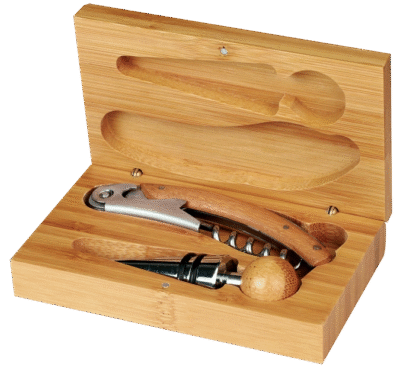 This Bamboo Wine Gift Set is a classic gift set perfect for any occasion. The bamboo accented pieces.